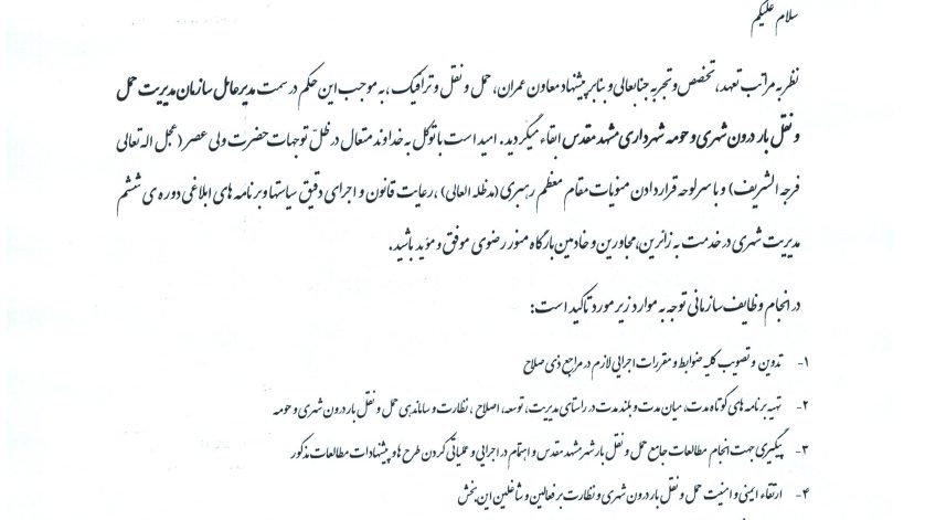 در حکم وی آمده است “نظر به مراتب تعهد، تخصص و تجربه جنابعالی و بنا بر پیشنهاد معاون محترم عمران، حمل و نقل و ترافیک، در سمت مدیرعامل سازمان مدیریت حمل و نقل بار درونشهری شهرداری مشهد ابقا می شوید”.